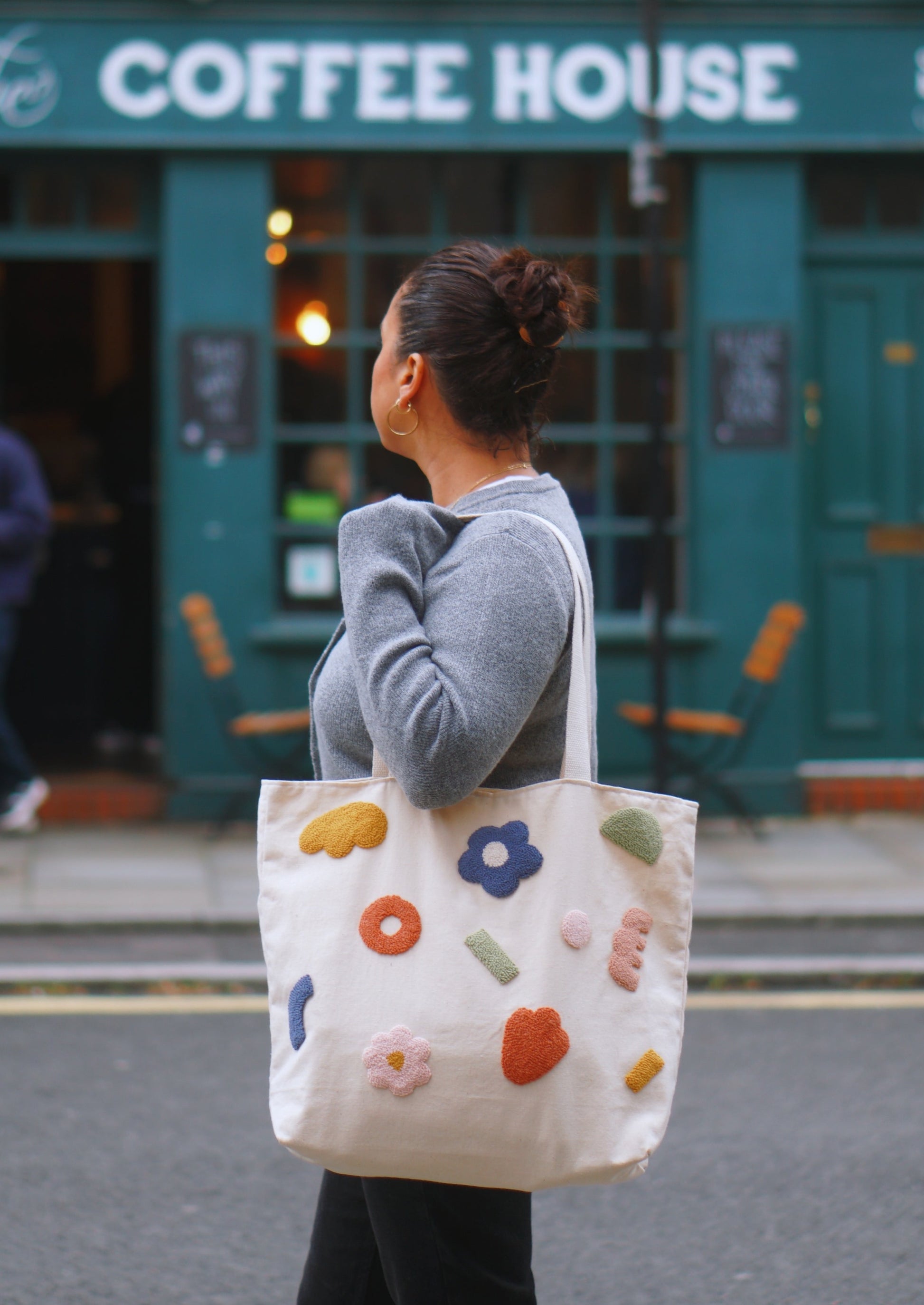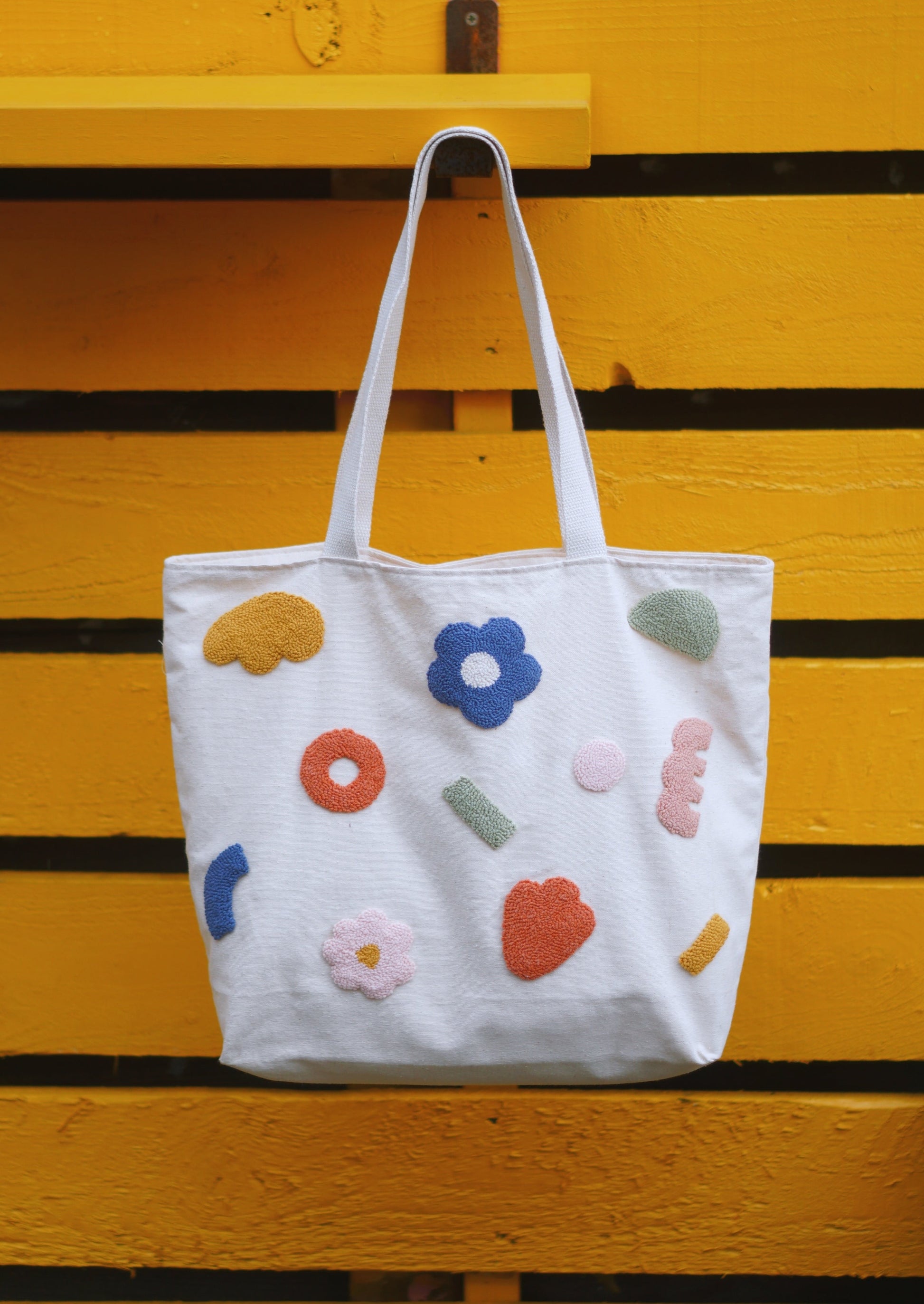 Canvas modern tote bag with a punch needle embroidery on.