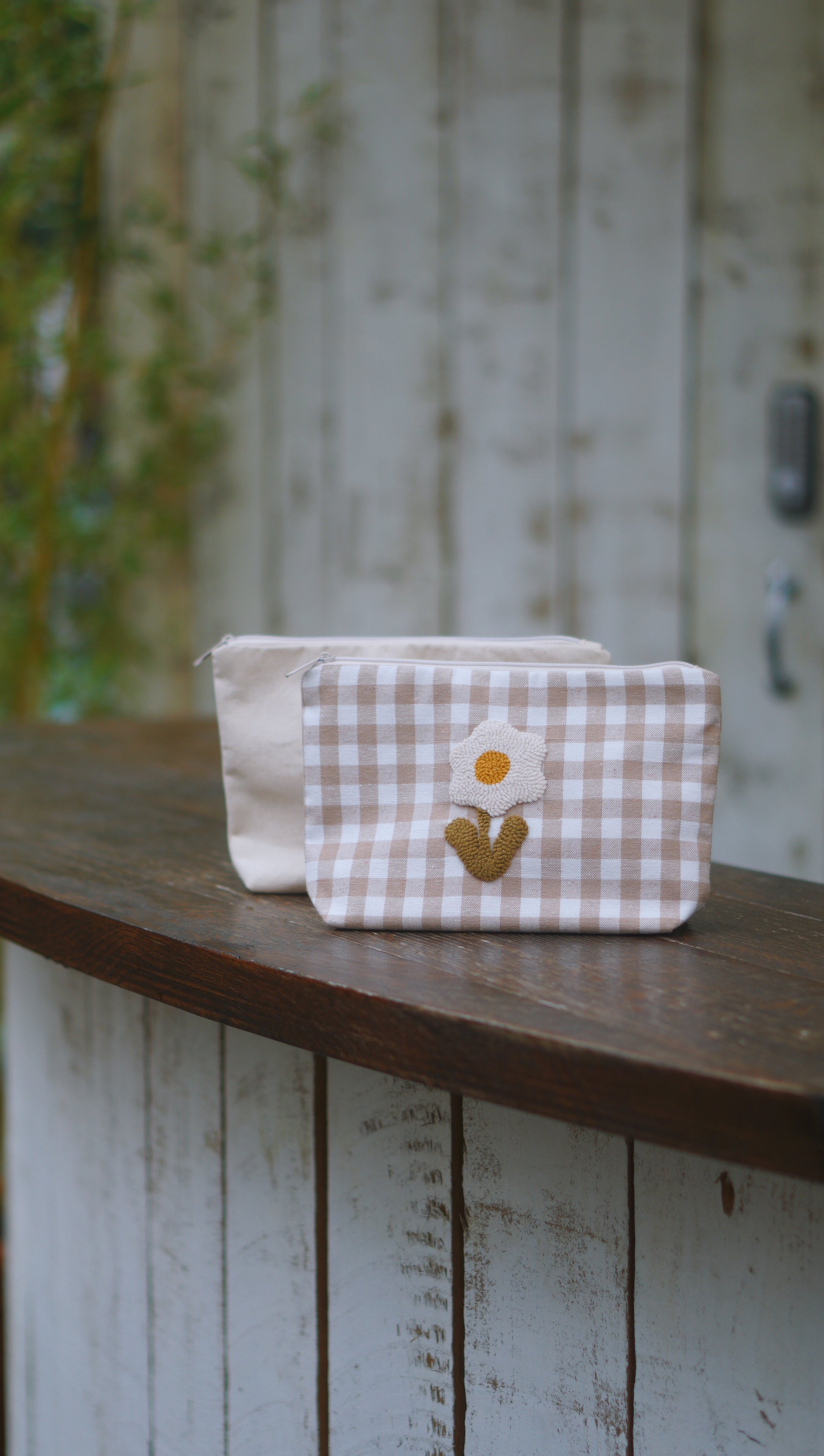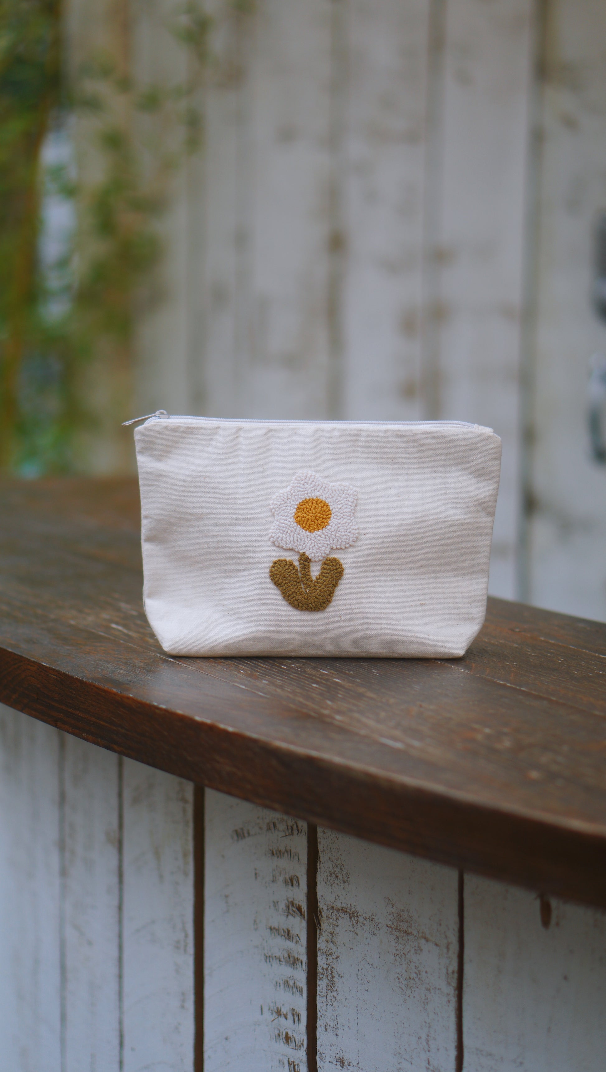 Makeup case with a cute daisy embroidery. Crafted from cotton with an undyed lining and finished with a zip and cotton pull.