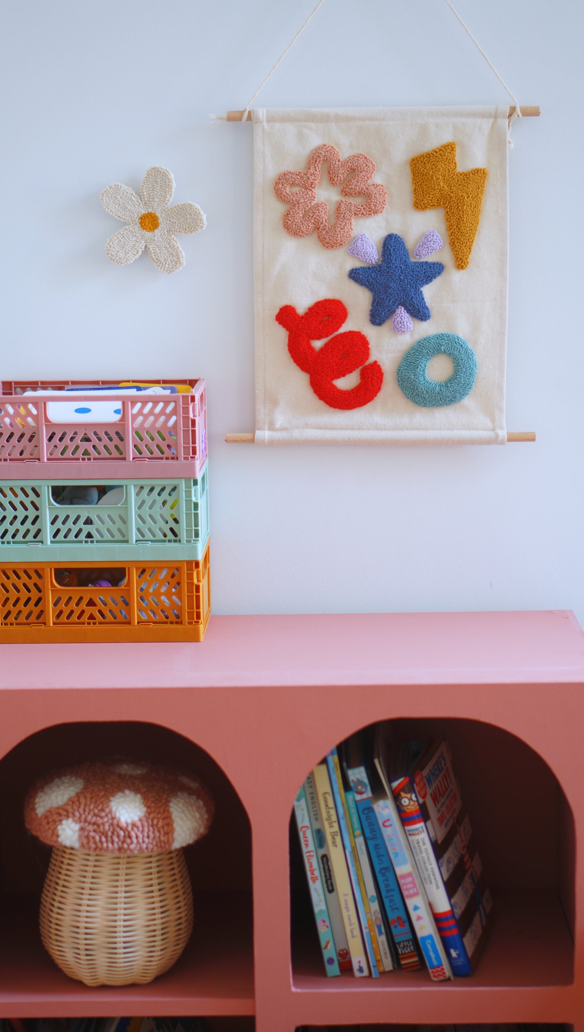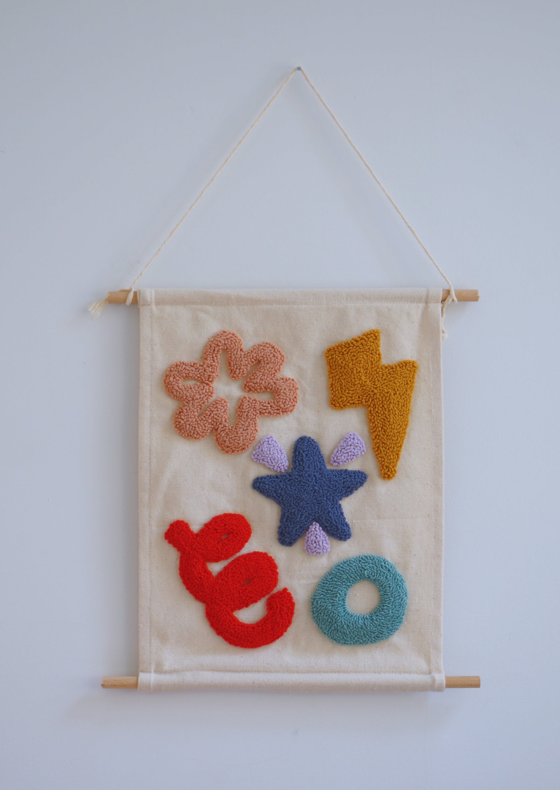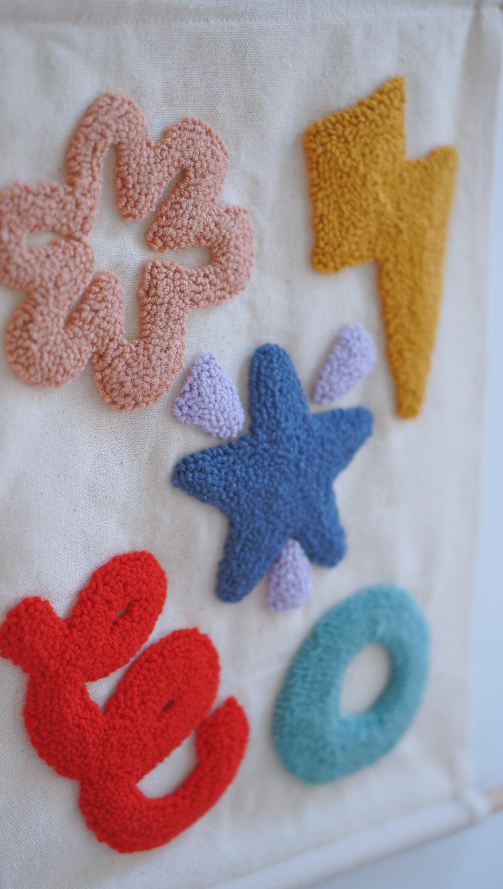 This cute decoration is lovingly handcrafted using a punch needle and features intricate handtufted details that bring this adorable design to life. Perfect for adding a pop of color and texture to your little one's bedroom or playroom, this one-of-a-kind wall hanging is sure to spark their imagination and creativity.