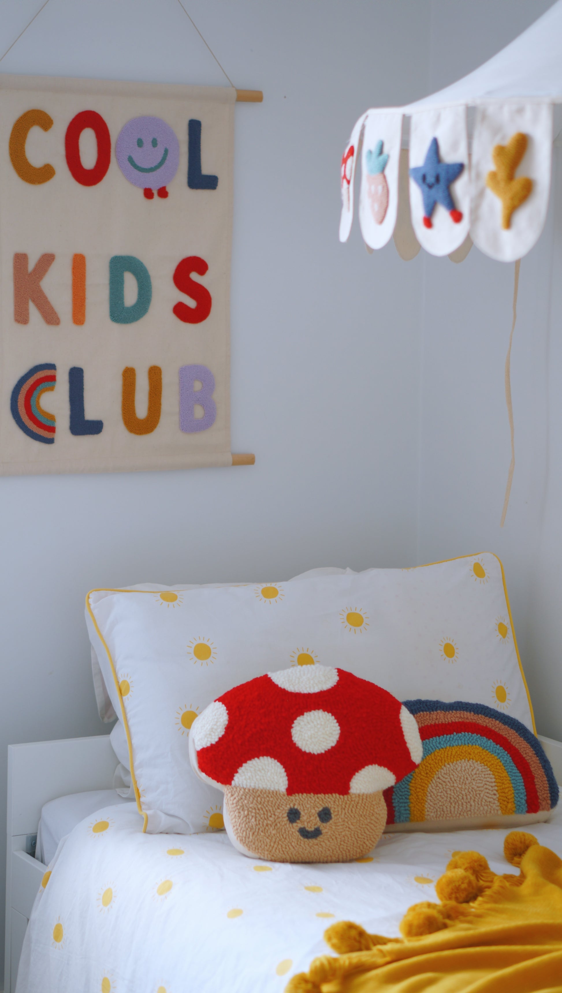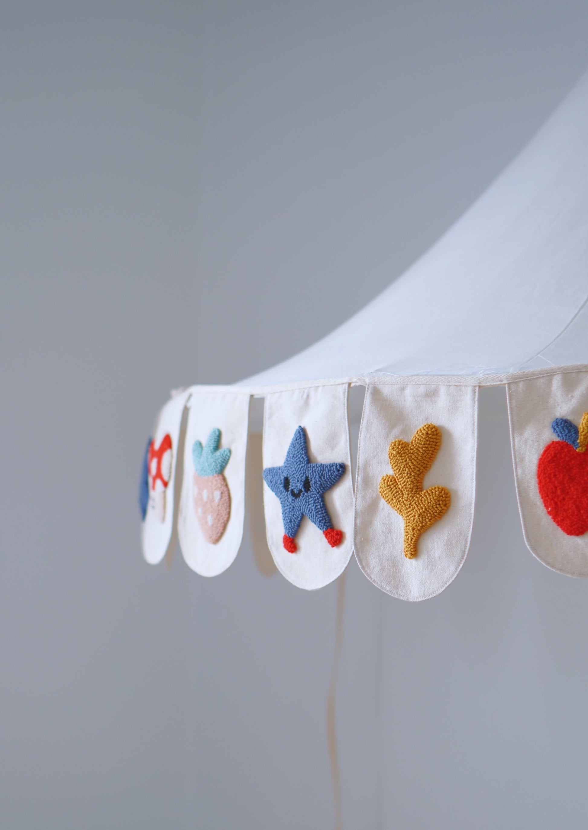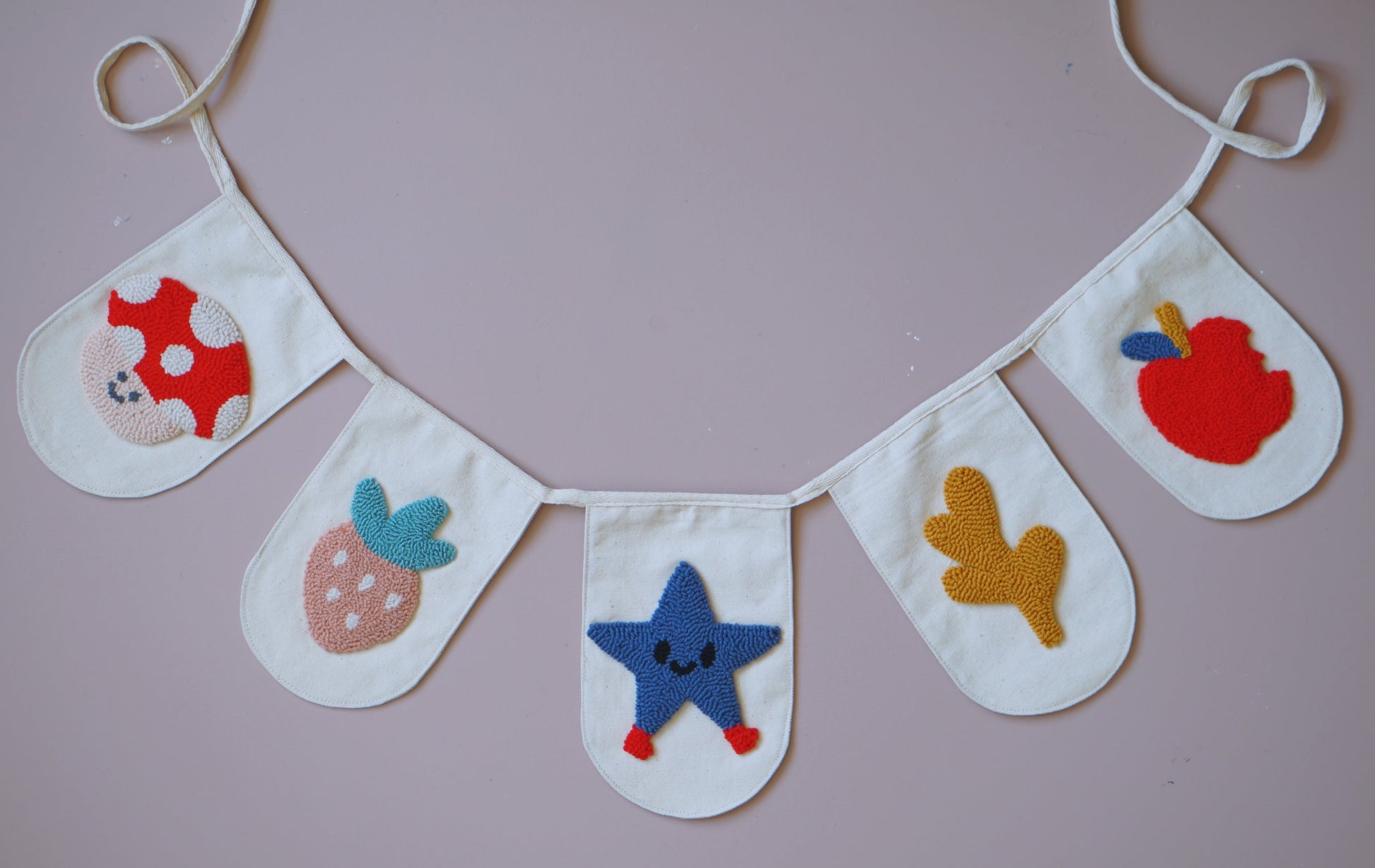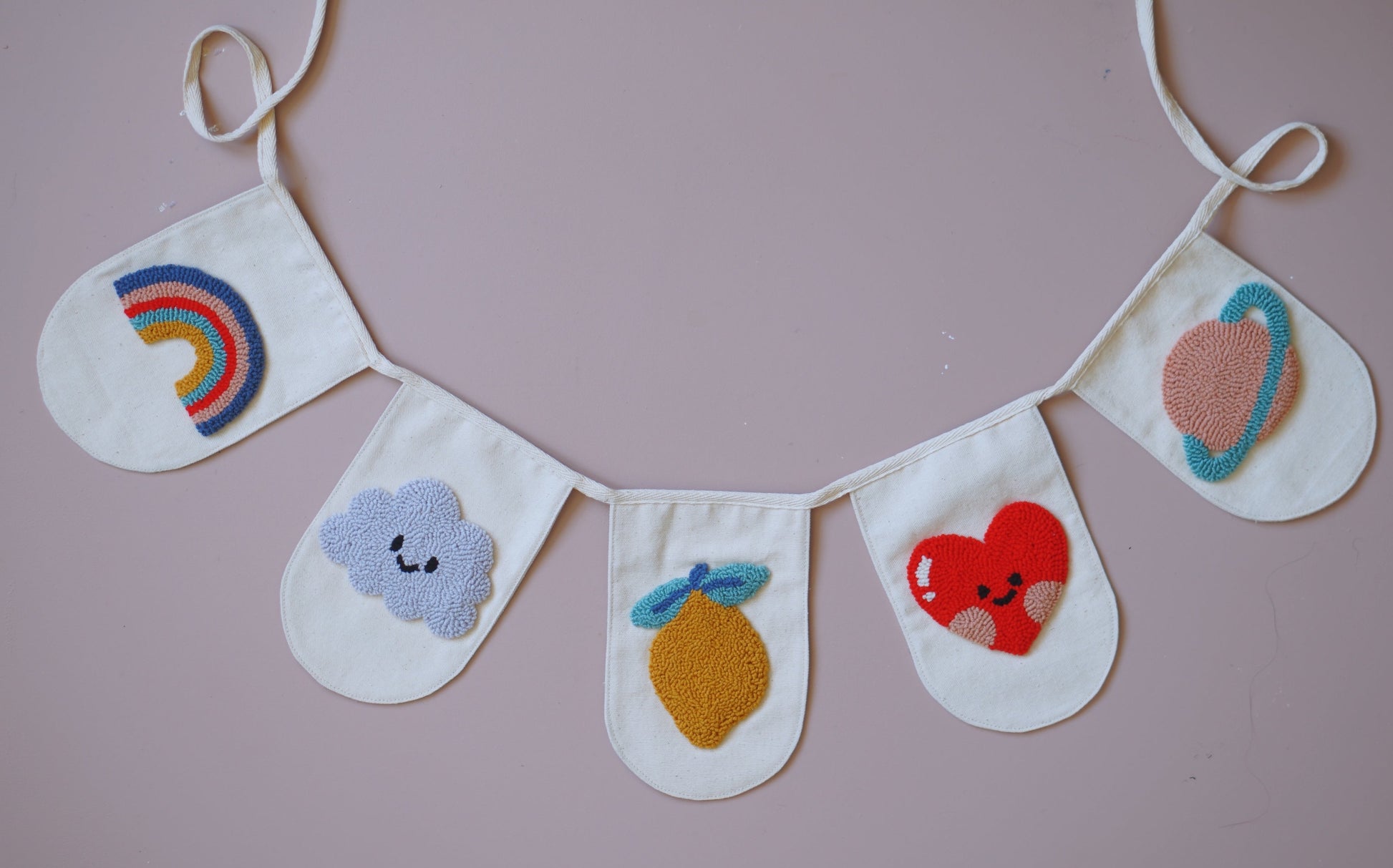 This cute bunting is lovingly handcrafted using a punch needle and features intricate handtufted details that bring this adorable design to life. Perfect for adding a pop of color and texture to your little one's bedroom or playroom, this one-of-a-kind bunting is sure to spark their imagination and creativity.