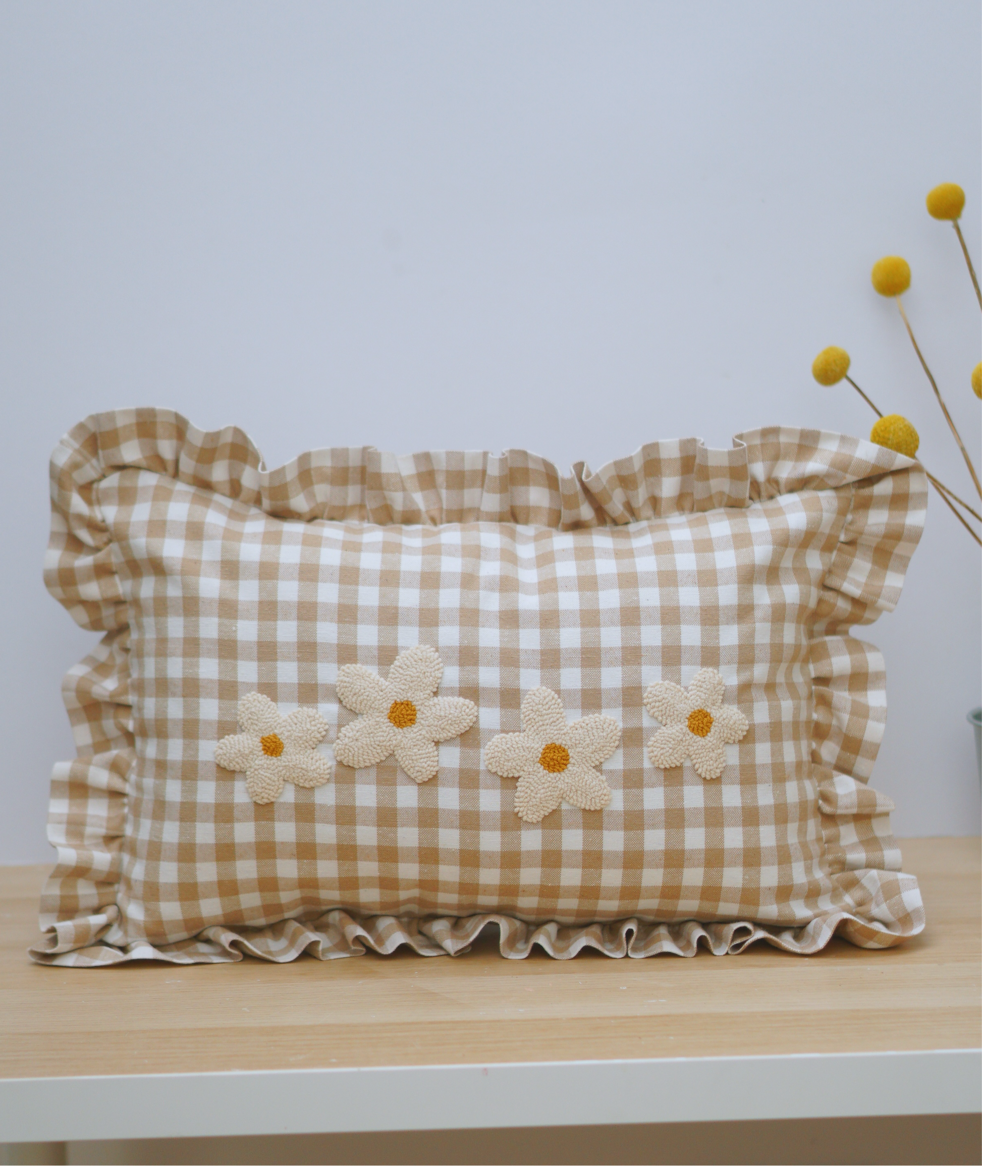 A floral embroidered cushion with a maximalist ruffle edge, the perfect addition to any bed, sofa, kids room or armchair.