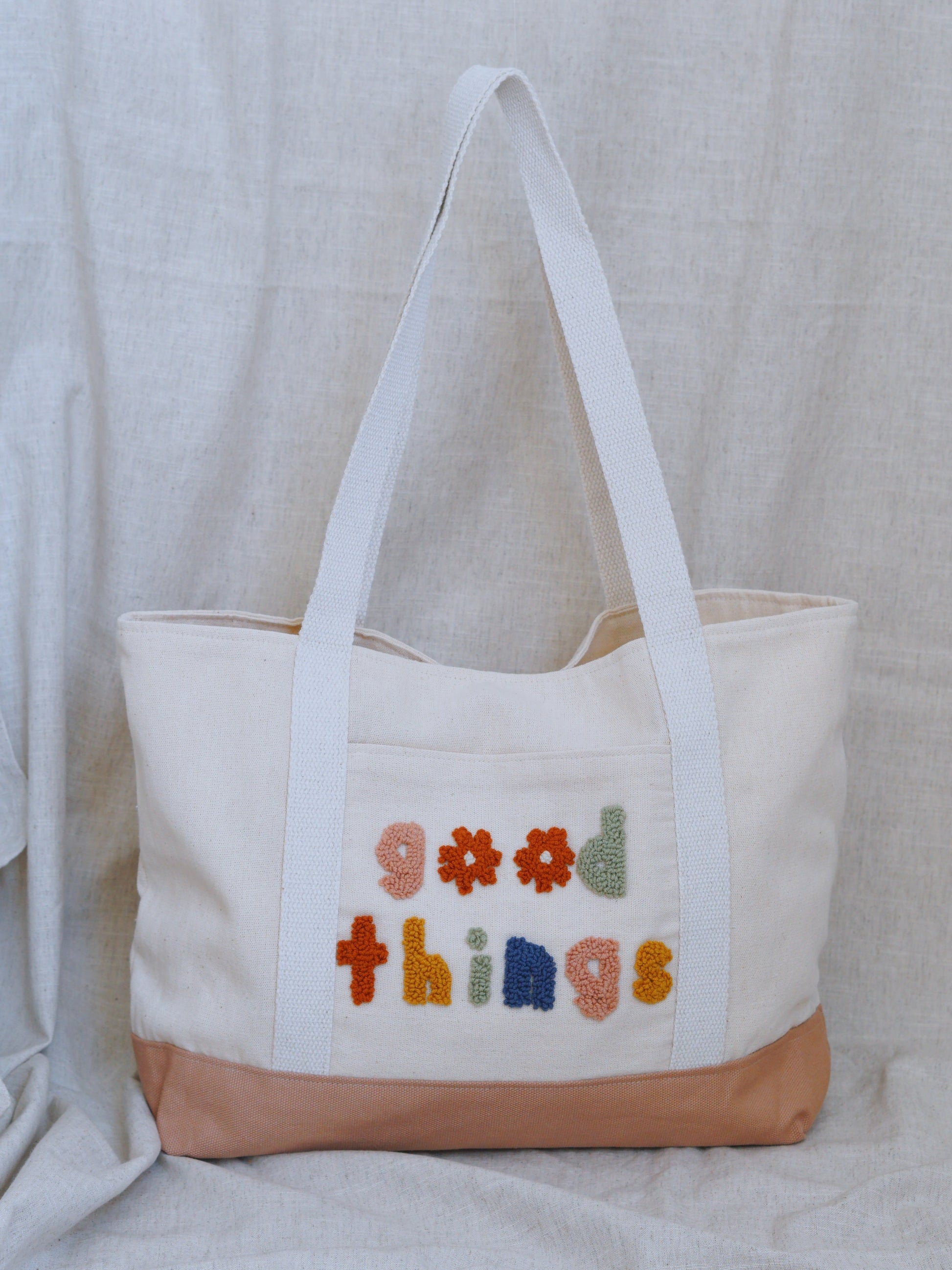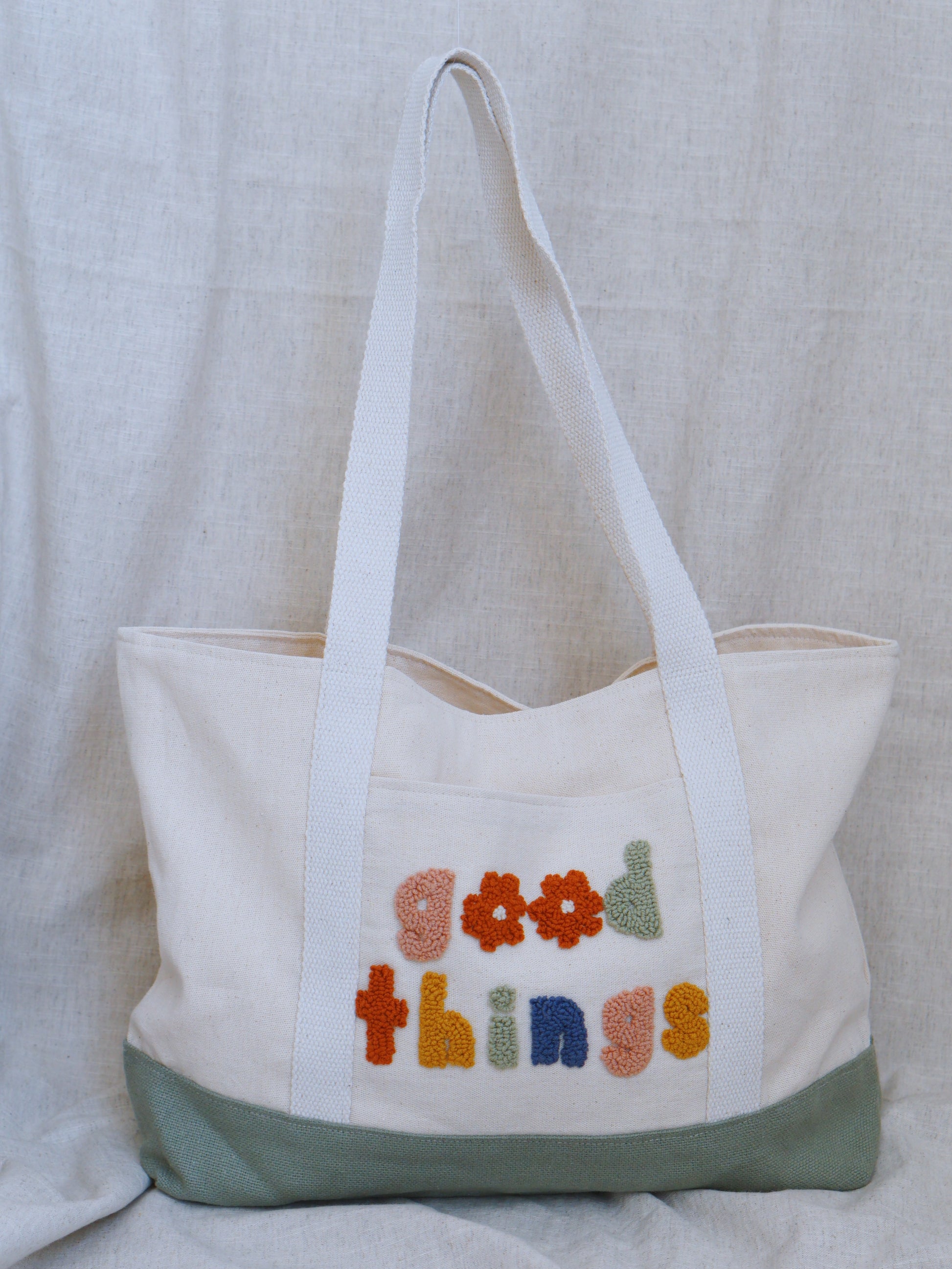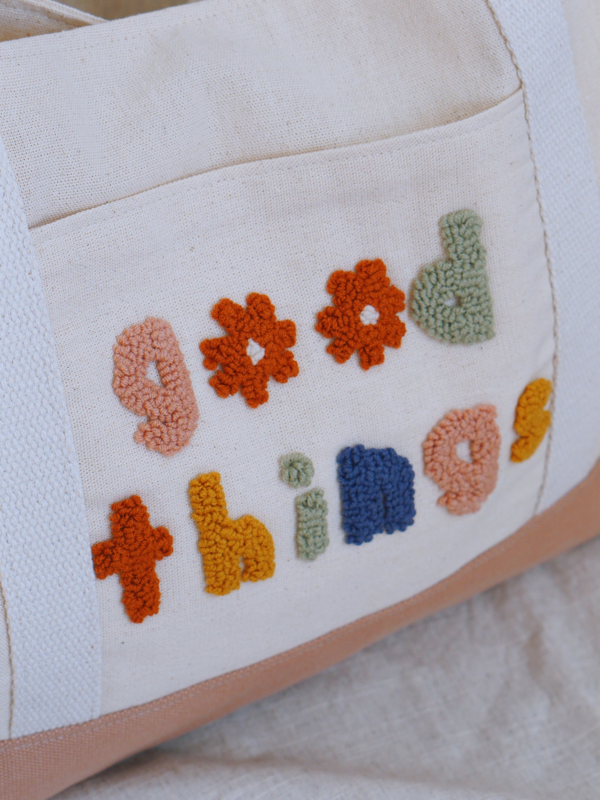 Canvas modern tote bag with a punch needle embroidery on.