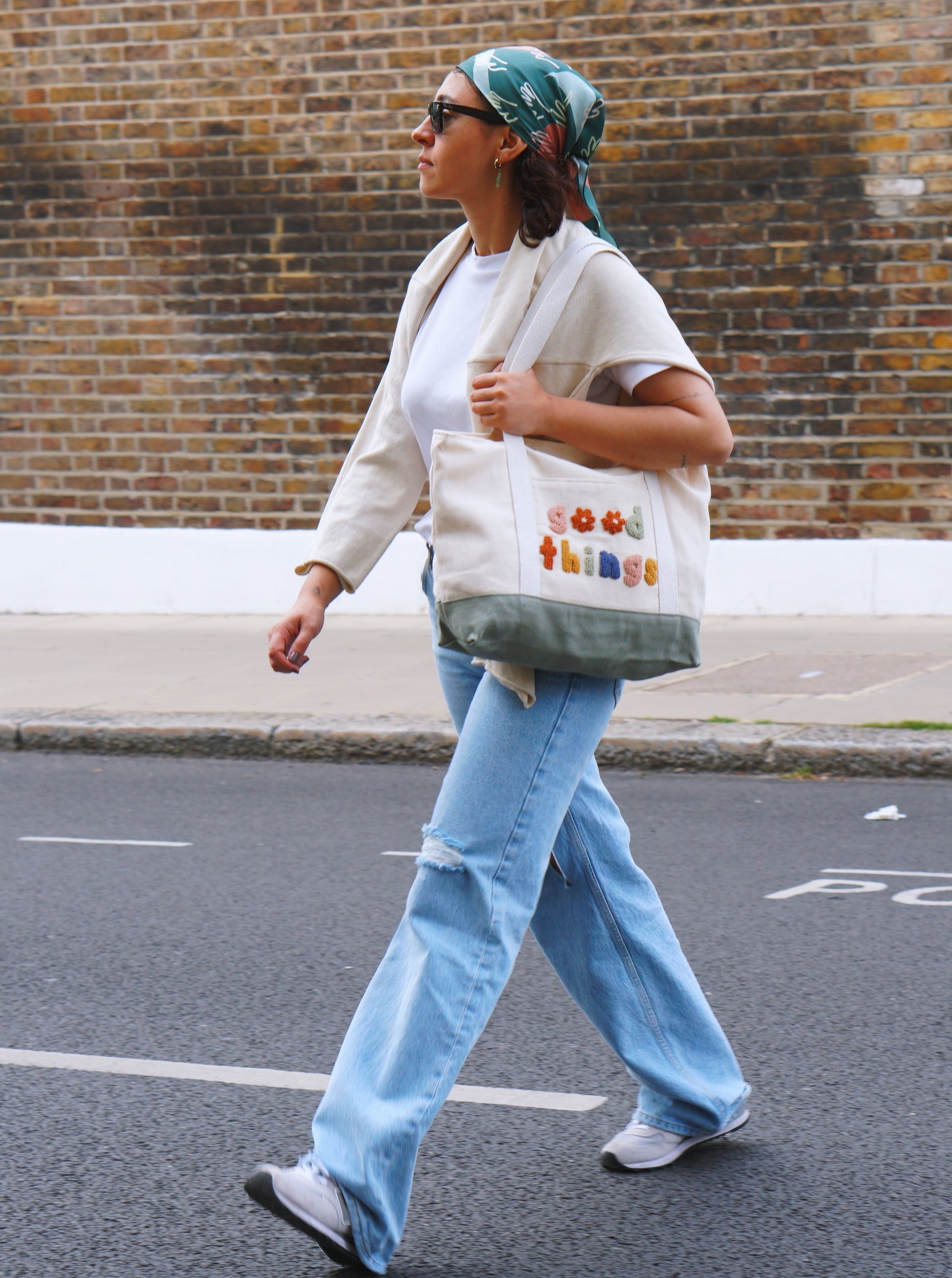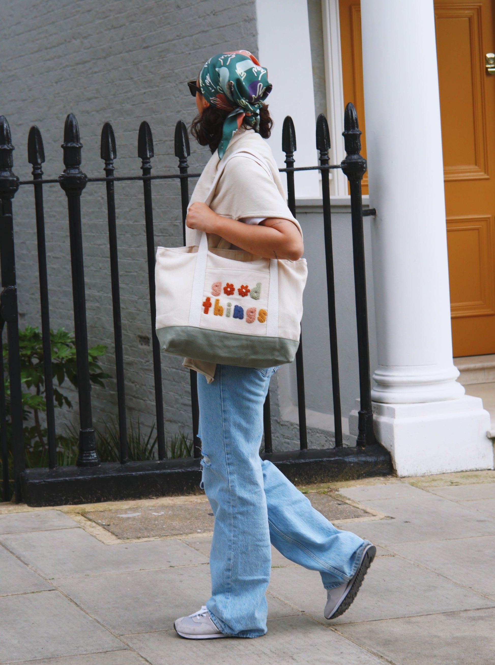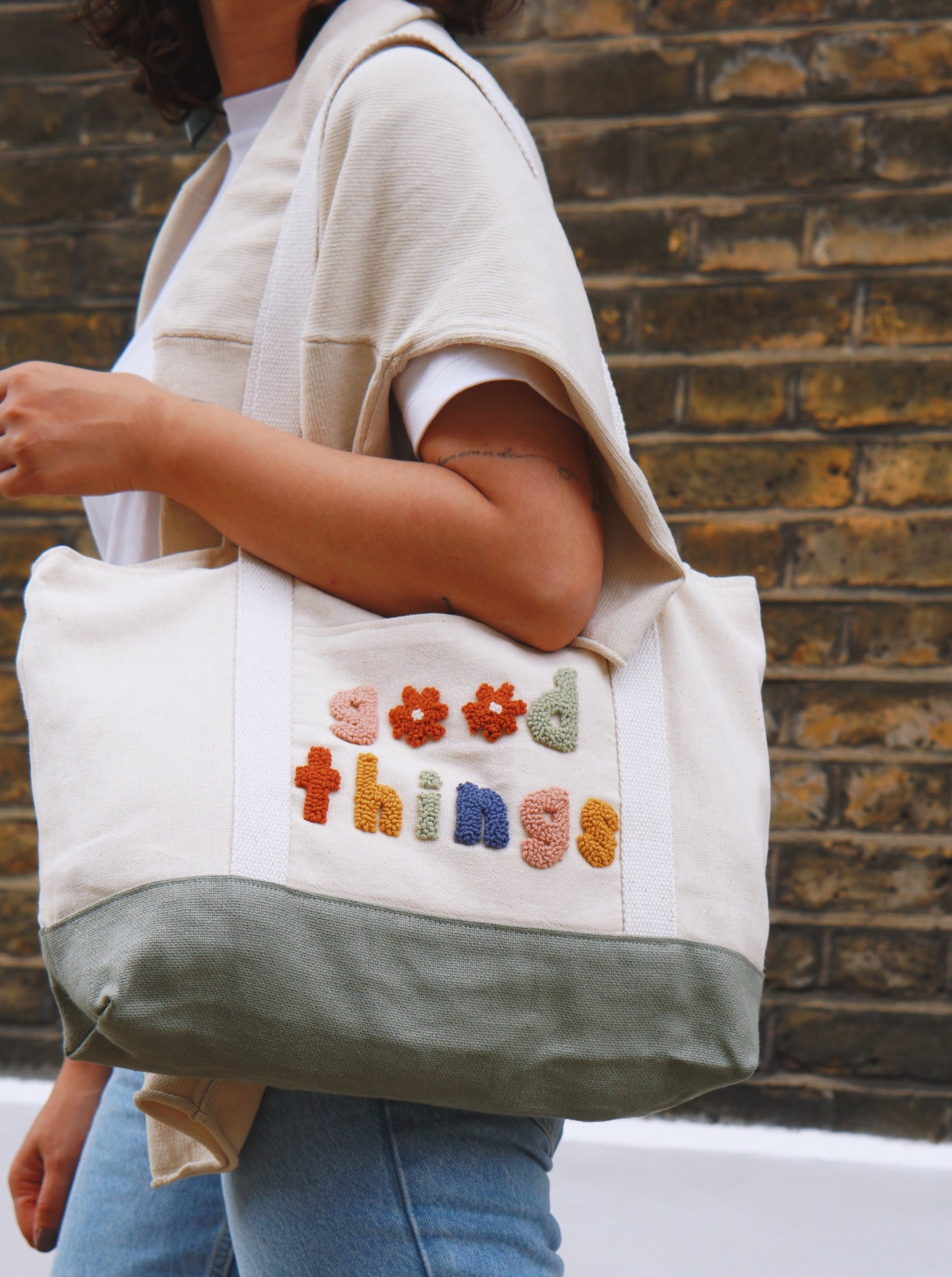 Canvas modern tote bag with a punch needle embroidery on.