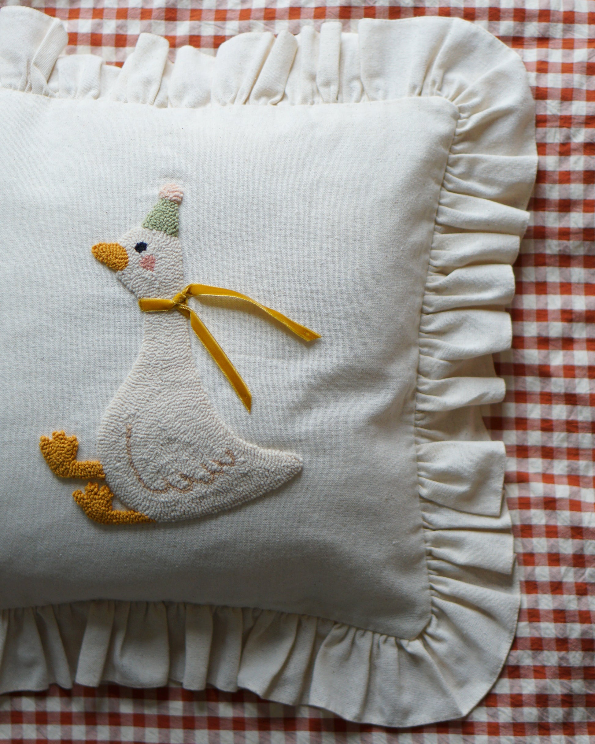 A cosy cottage core goose embroidered cushion with a maximalist ruffle edge, the perfect addition to any nursery, bed, sofa or armchair. Each Dutugo piece is lovingly hand tufted by using a special punch needle.